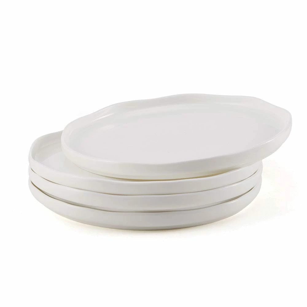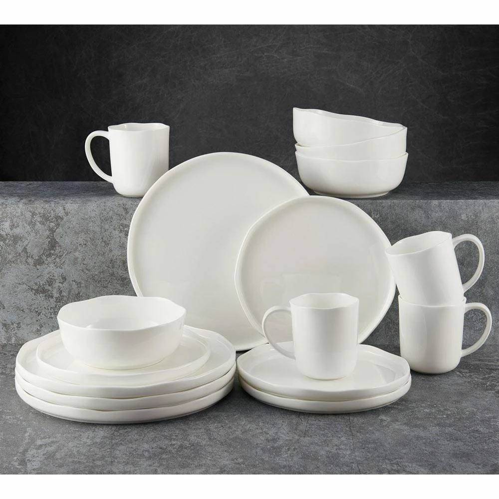 This Mikasa Adelaide Dinnerware Set features a distinctly modern twist. Round pieces are given a contemporary, organic design element, with uniquely curved rim edges and plates with raised sides. Crafted of bone china. 16 piece dinnerware set, service for four, includes (4) each: 10-1/2 inch dinner plate, 8-1/4 inch salad plate, 5-3/4 inch bowl, and 14 ounce mug. Microwave and dishwasher safe.