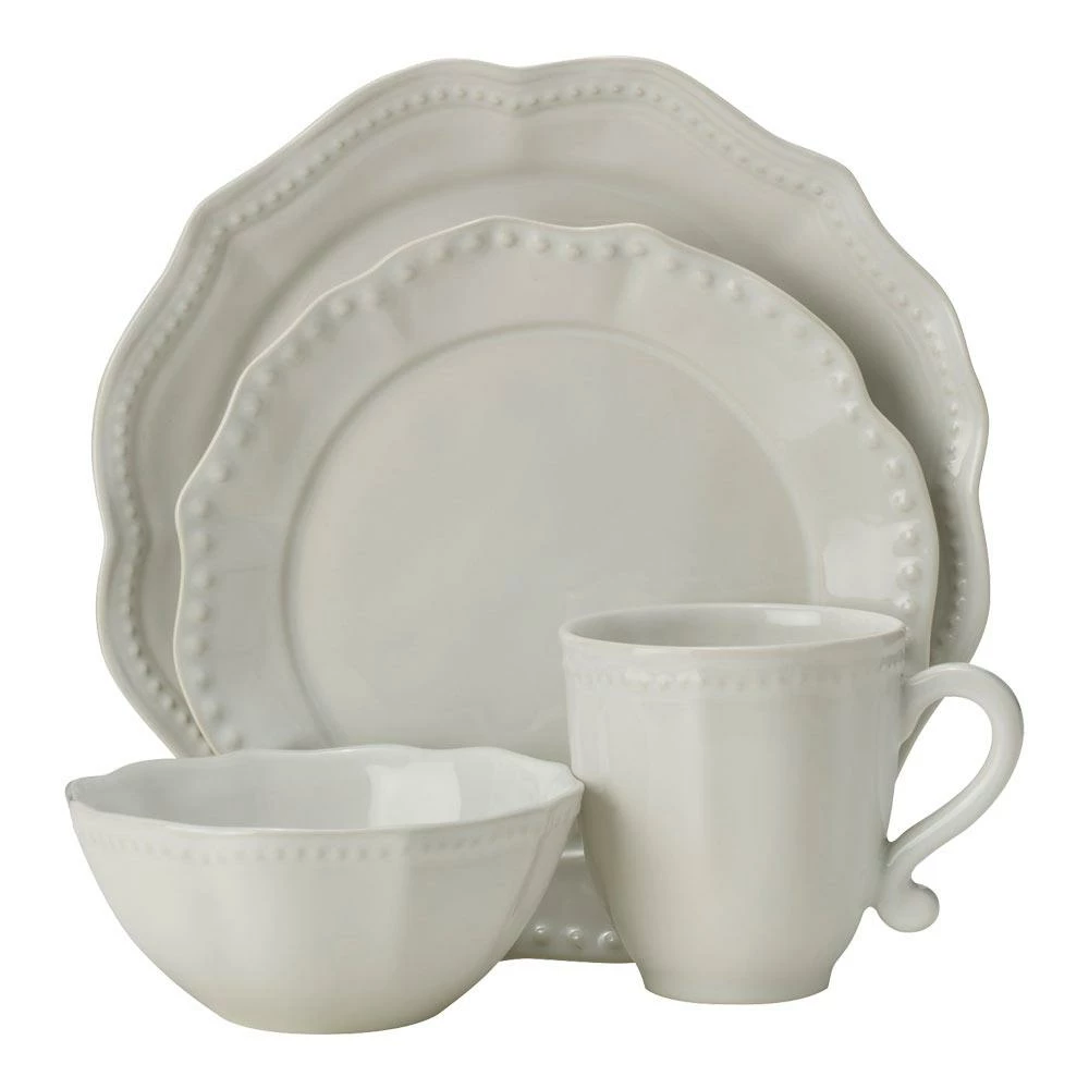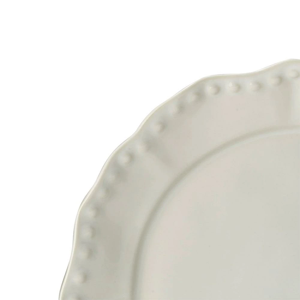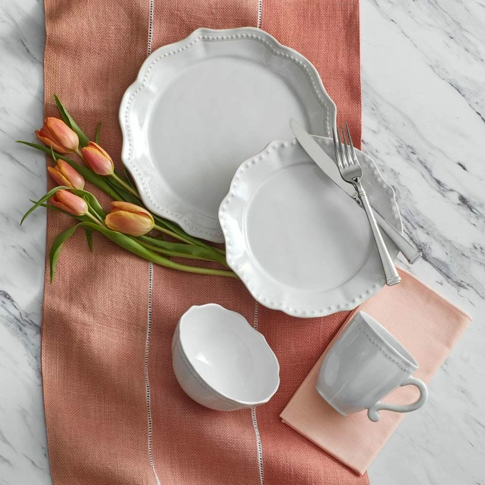 Set a traditional table with Alyse Dinnerware, by Mikasa. Beautifully crafted from high-quality stoneware, this traditional dinnerware features bold scalloped edges framed with an embossed bead pattern. Classic and sophisticated, this basic white collection is the perfect complement to your favorite stemware and flatware. Microwave and dishwasher safe. 4 piece place setting includes an 11 inch dinner plate, 9 inch salad plate, 6 inch soup bowl and 12 ounce mug.