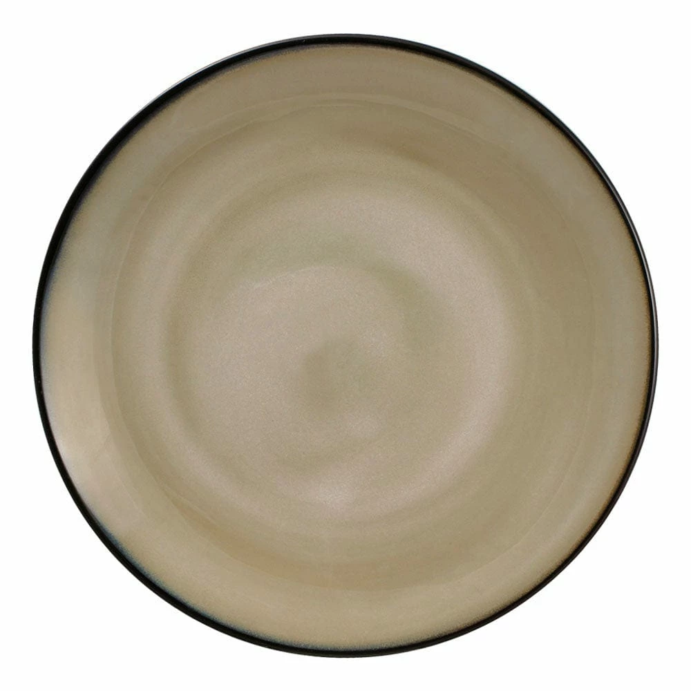 This Anissa Set of 4 Dinner Plates feature an earthy beige background with a dark band highlighting the rim, in a reactive glaze finish. Due to the nature and hand-crafted qualities of reactive glaze, no two pieces are exactly alike and will exhibit unique variations in color and pattern. Product may slightly differ from image shown.