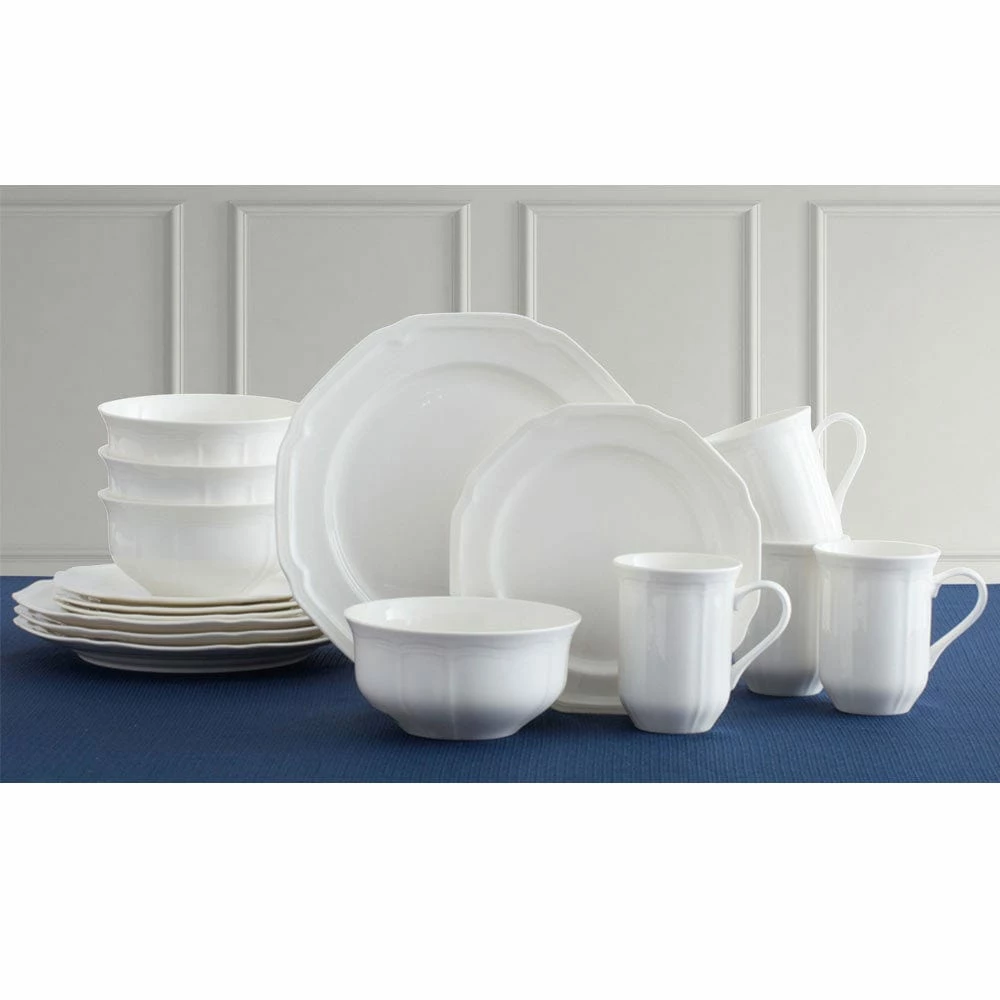 This uniquely-shaped all-white design adds a touch of elegance to a traditional setting. It coordinates perfectly with both formal and casual stemware and flatware as well as our own Antique Orchard pattern. There is a complete suite of accessories to create a classically stylish casual dining statement. This high quality porcelain pattern is dishwasher safe, microwave safe and chip resistant. 16 piece dinnerware set, service for (4), includes (4) each: 10-1/2 inch dinner plate, 8-1/2 inch salad plate, 6 inch diameter (32 ounce) cereal bowl and 12 ounce mug.