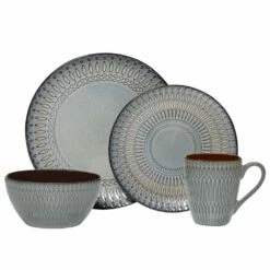 Crafted of Stoneware, featuring a reactive glaze. Due to the nature and hand-crafted qualities of reactive glaze, no two pieces are exactly alike and will exhibit unique variations in color and pattern. Product may slightly differ from image shown. 16 piece dinnerware set, service for four, includes (4) each: 10-1/2 inch dinner plate, 8-3/4 inch salad plate, 6-1/4 inch soup cereal bowl and 13-1/2 ounce mug. Microwave and dishwasher safe.