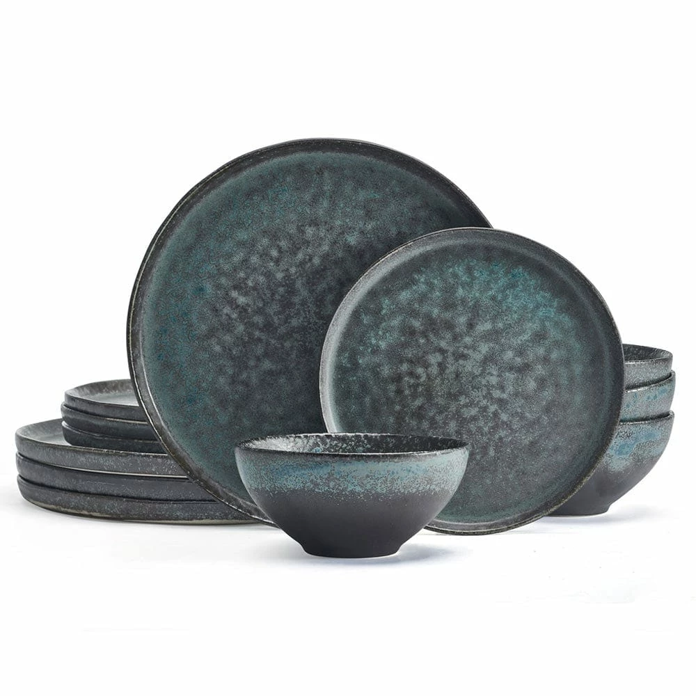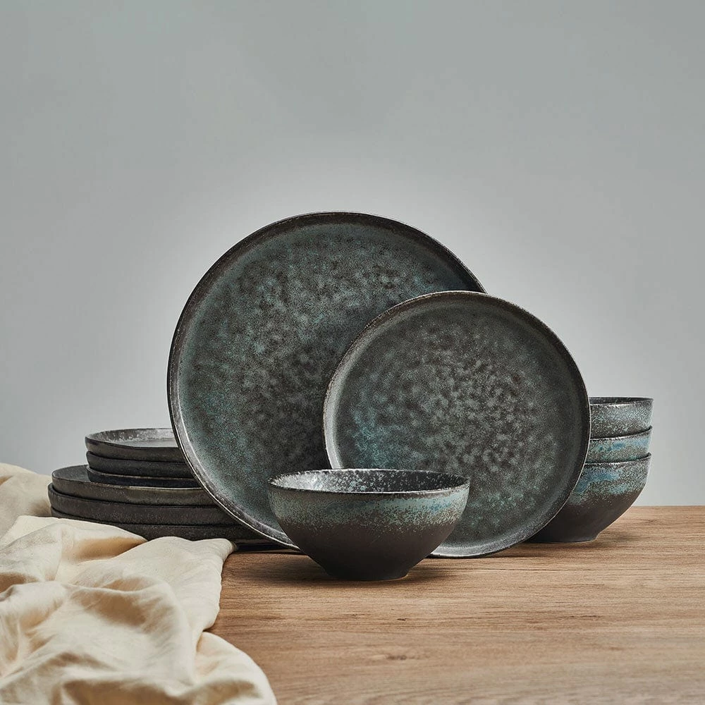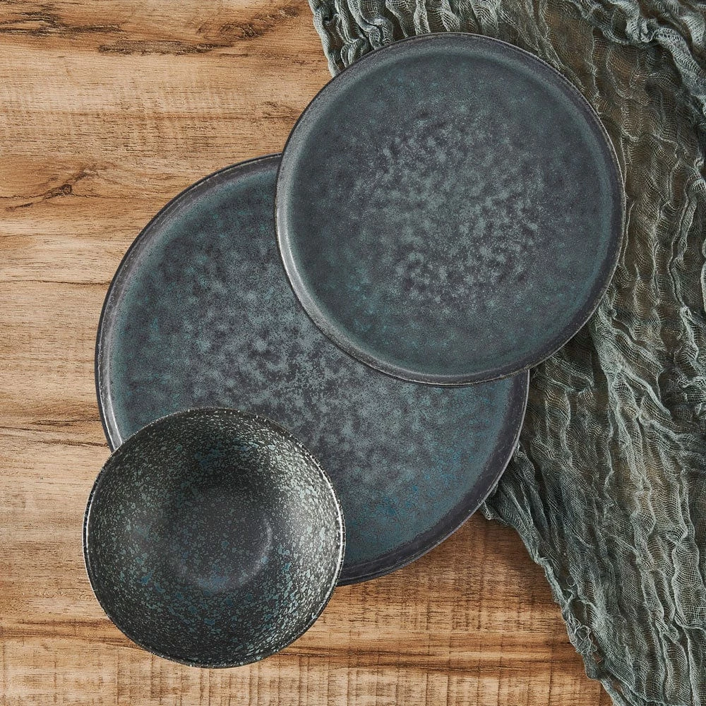 This Bryn Dinnerware Set features a striking dark gray and turquoise reactive glaze design, and will bring modern appeal to your table. Due to the nature and hand-crafted qualities of reactive glaze, no two pieces are exactly alike and will exhibit unique variations in color and pattern. Product may slightly differ from image shown.