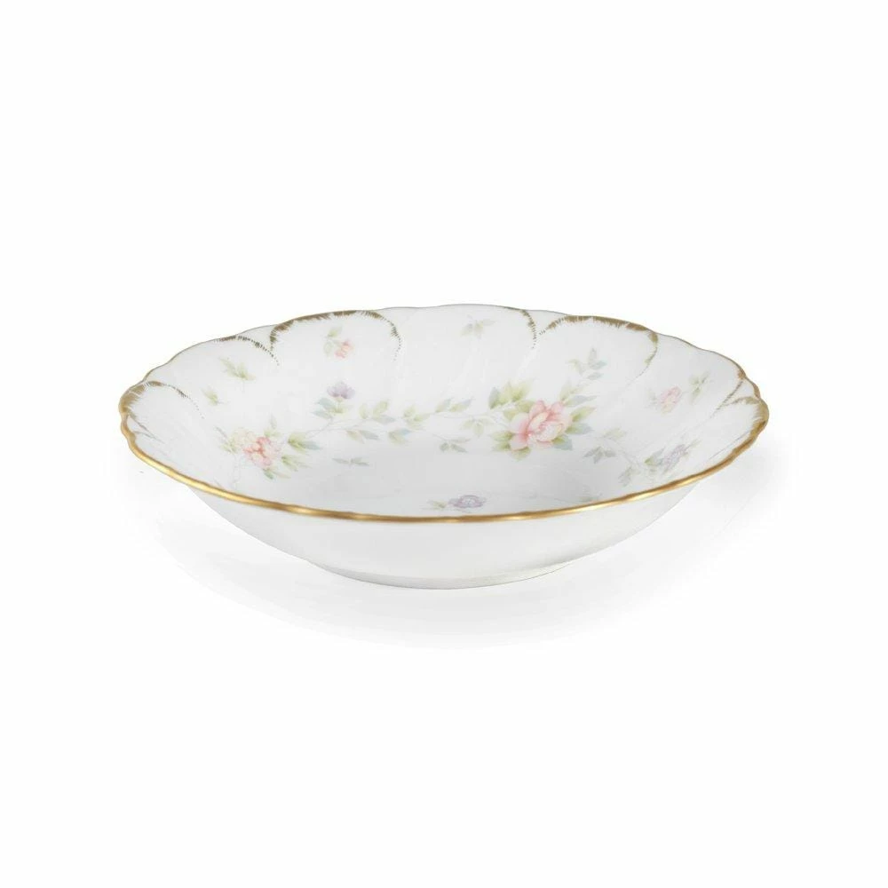 A soft color palette and a garland of delicate flowers adorn the scalloped shapes of each piece. Every piece is accented with gold band. Constructed of Bone China. Hand wash only. The bowl measures 6 inches in diameter and holds 9 ounces.