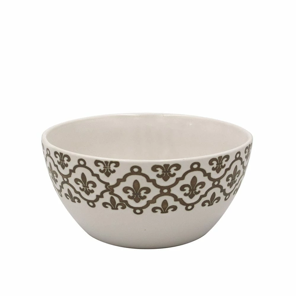 This Celebrations Fleur de Lis Soup Cereal Bowl features a white background with a distinct gold band pattern around the upper rim, and will add a stylish, festive look to your table.