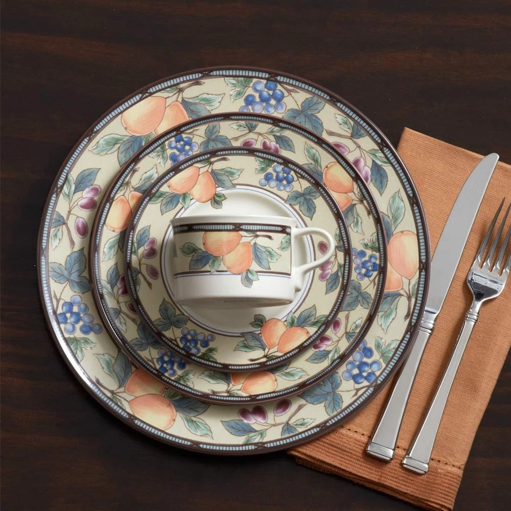 Colorful fruits and leaves enliven the Garden Harvest pattern. This longtime favorite is perfect for everyday use and has a wide array of accessories to create a complete casual dining statement. This pattern coordinates perfectly with casual stemware and flatware and is dishwasher safe, oven safe, freezer safe and microwave safe. Crafted of stoneware. Salad plate measures 8-1/4 inch diameter.
