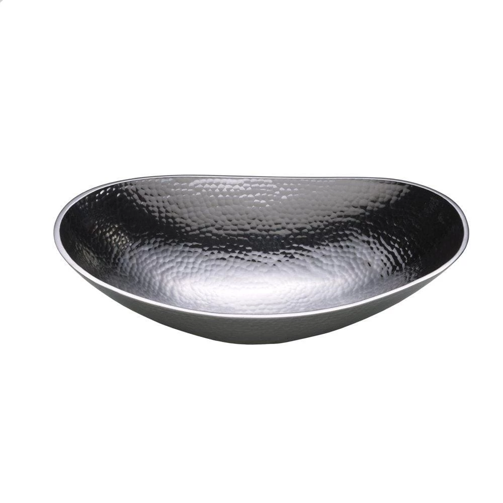 Perfect for serving your guests everything from mashed potatoes to pasta. This bowl is durable and has a rustic hammered finish. It is crafted of food-safe alternative metal alloy. This oval bowl will not scratch or dent under normal use. Oven safe for warming food and freezer safe. Hand wash. Oval bowl measures 12 inch diameter x 3-1/2 inch deep.
