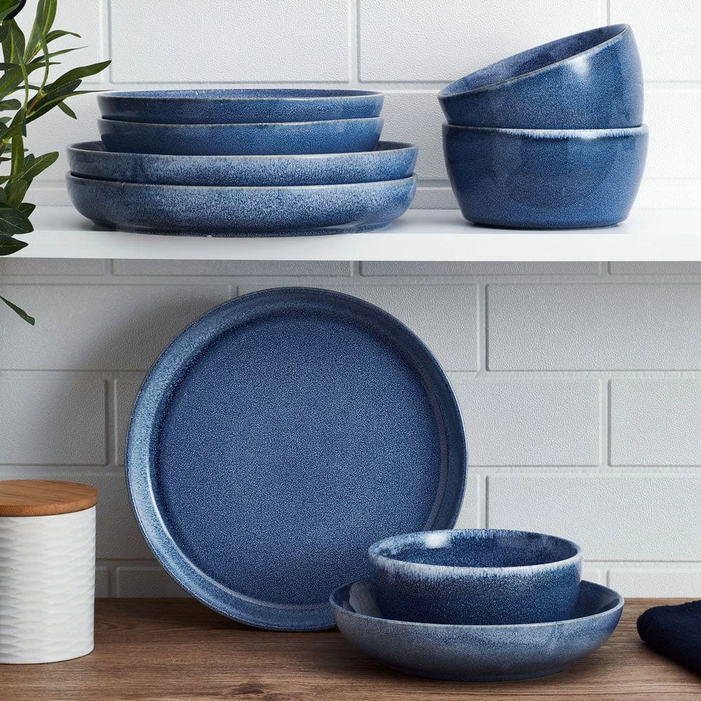 This Huxley Blue Dinnerware Bowl Set features a blue reactive glaze finish on contemporary, stylish pieces and is perfect for everyday use. Due to the nature and hand-crafted qualities of reactive glaze, no two pieces are exactly alike and will exhibit unique variations in color and pattern. Product may slightly differ from image shown.