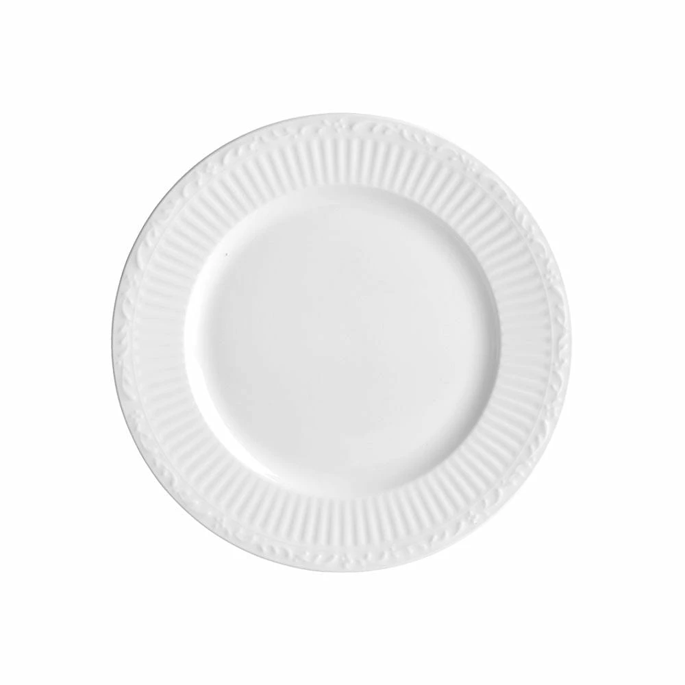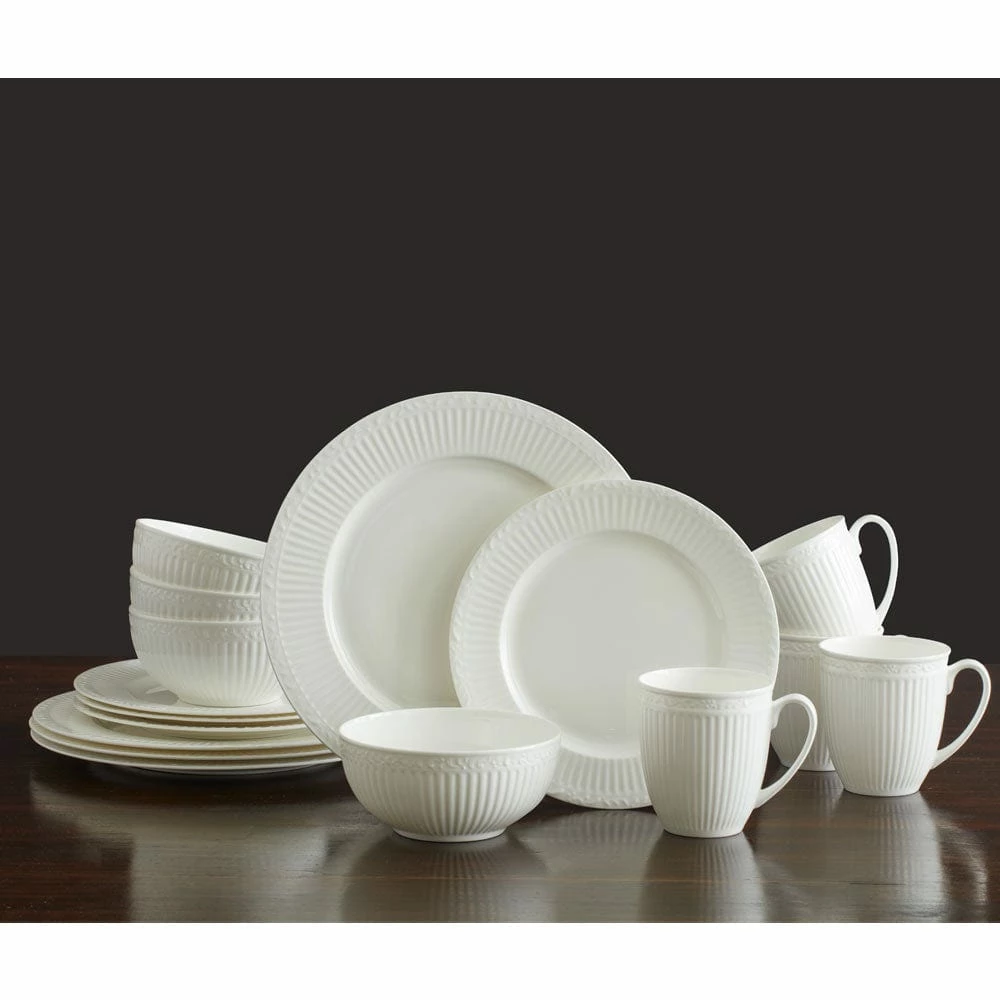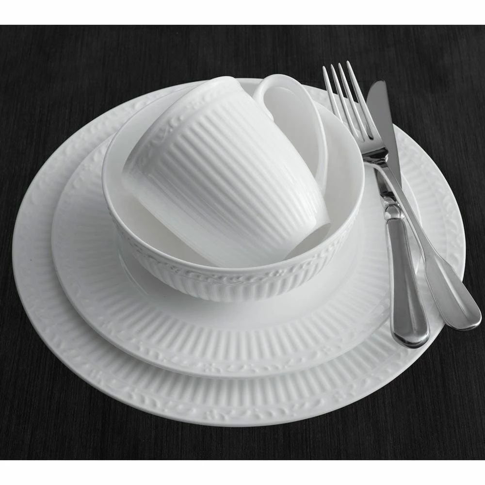 Italian Countryside Bone dinnerware in a crisp white color with fluted bands and column-like detailing recall classical Italian architecture. Bring elegant sophistication to every dining occasion. Each service includes: 11-1/4 inch dinner plate, 9 inch salad plate, 6 inch (26 ounce) soup cereal bowl and 14 ounce mug.