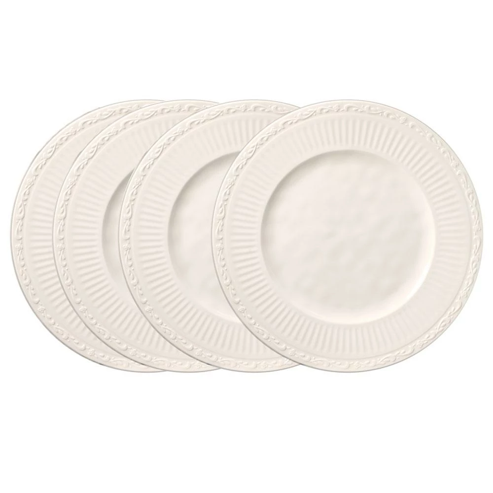 A bestselling pattern for over 20 years is now available in melamine. Fluted bands and intricate scrolls of this cream colored pattern are transformed into heavy weight shatterproof melamine, making it a natural for entertaining outdoors or your casual meals. BPA Free. Dishwasher Safe. Not suitable for microwave use. Set of 4 melamine dinner plates, each measures 11 inch diameter.