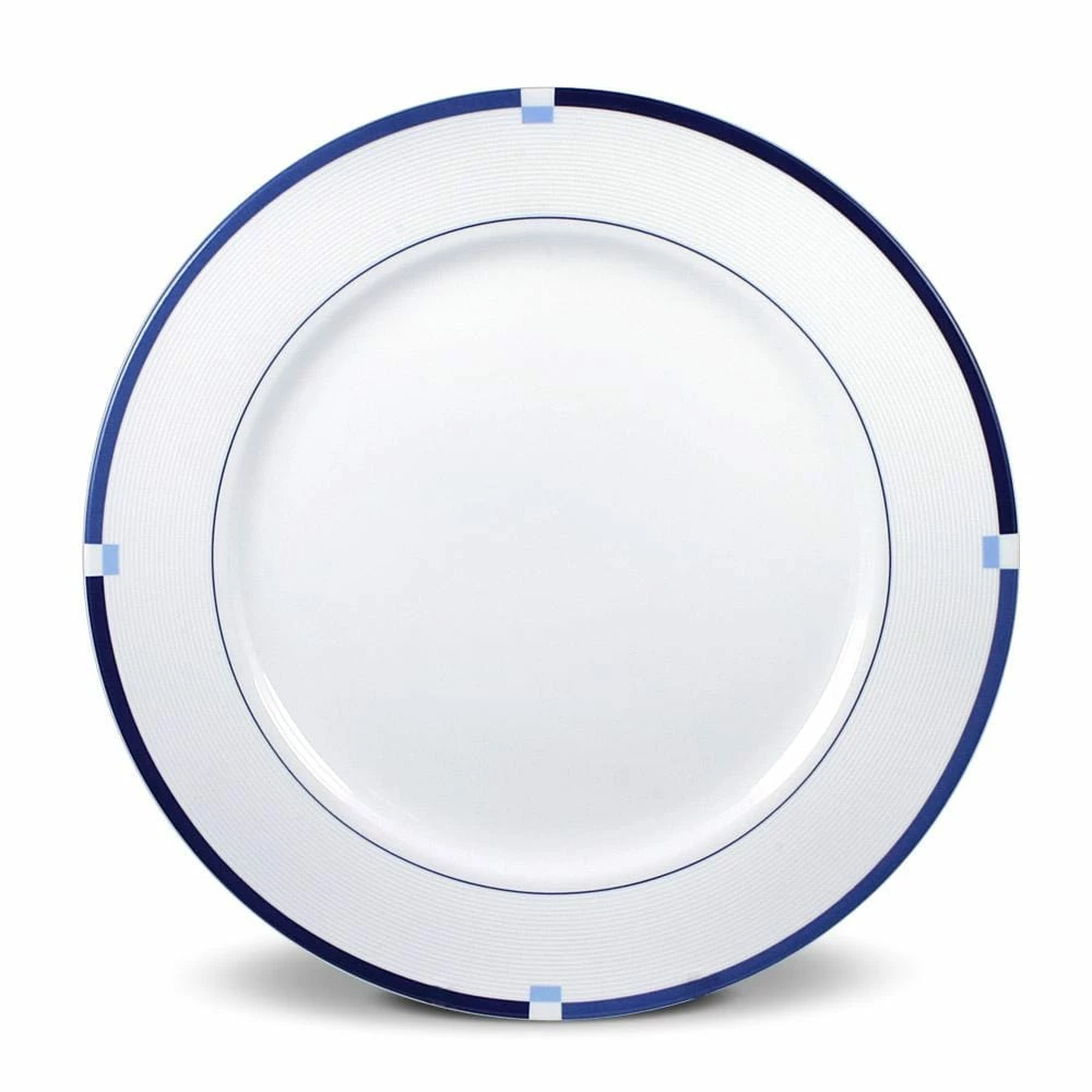 Jet Set Blue re-imagines a standard dinnerware pattern for contemporary dining. The simple white center is outlined with a thin blue border, but it is the outer rim that captures the eye, with a subtle ridged element framed by a thicker band of alternating blue tones. These are broken into four quadrants by unique tab accents. The look transforms your tabletop into a canvas of modern design and color. This dinner plate is ideal for your main meal, but also makes a great small serving platter. Crafted of porcelain. Microwave and dishwasher safe. Dinner plate measures 11-1/4 inch diameter.