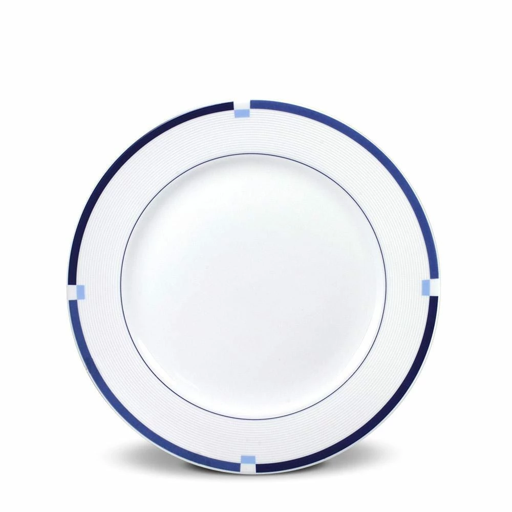 Jet Set Blue re-imagines a standard dinnerware pattern for contemporary dining. The simple white center is outlined with a thin blue border, but it is the outer rim that captures the eye, with a subtle ridged element framed by a thicker band of alternating blue tones. These are broken into four quadrants by unique tab accents. The look transforms your tabletop into a canvas of modern design and color. This salad plate is great for salads, but can also be used for a sandwich and chips, dessert or a snack. Crafted of porcelain. Microwave and dishwasher safe. Salad plate measures 8-1/4 inch diameter.