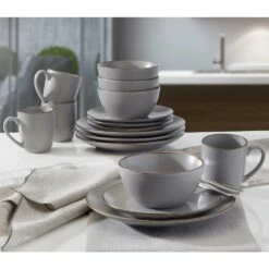 Crafted of stoneware. 16 piece dinnerware set, service for four, includes (4) each: 10-1/2 inch dinner plate, 8-1/4 inch salad plate, 6 inch diameter soup bowl and 13 ounce mug. Microwave and dishwasher safe.