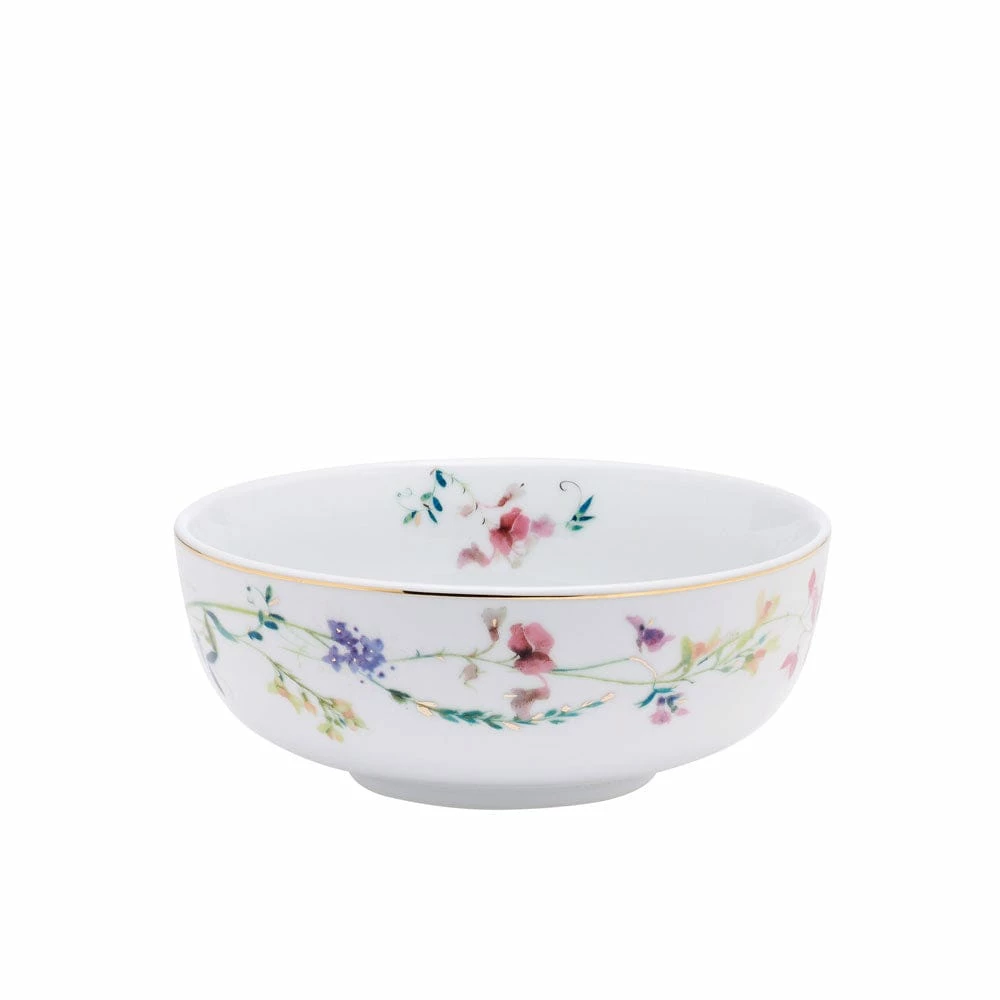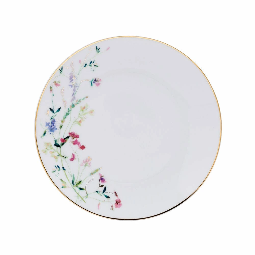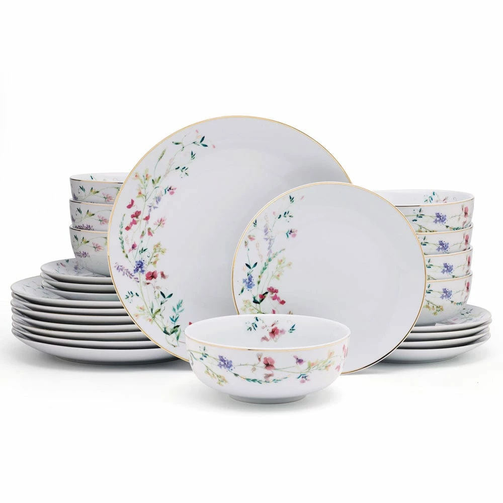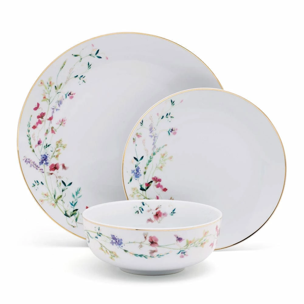 This Kalina Gold Dinnerware Set features a crisp white background adorned with a wisp of floral buds that dance delicately up one side, highlighted with metallic gold accents and a metallic gold rim that will add a touch of sophistication to your table.