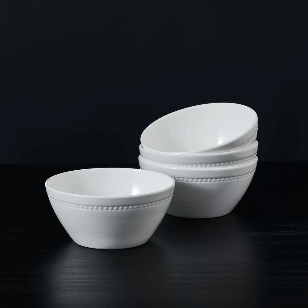 This Loria Set of 4 Soup Cereal Bowls feature a pristine white background with a simplistic embossed bead design wrapping around the rim, and will add a touch of style to your table.