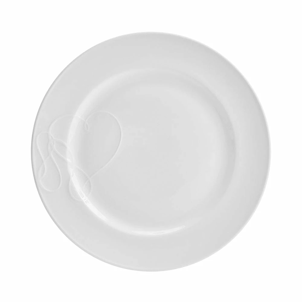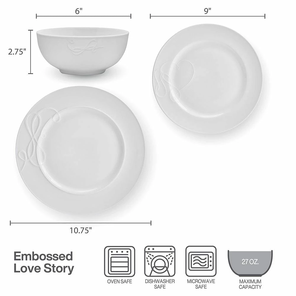 This Love Story White Dinnerware Set features a white body, with a distinctively different embossed pattern decorating the rim of each piece, and the elegant design can be used for formal or casual entertaining.