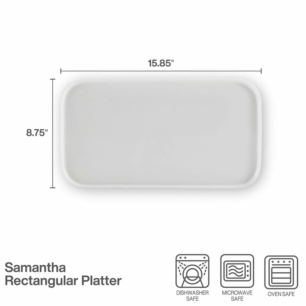 This Samantha Rectangular Platter features a low, wide design, in crisp white that will compliment and add a distinctly modern touch to your table.