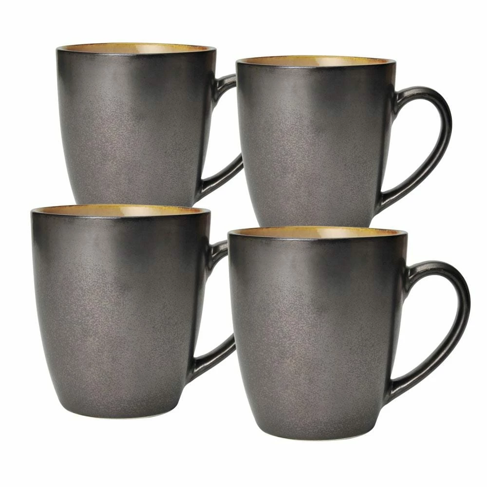 Crafted of Stoneware, featuring a reactive glaze. Due to the nature and hand-crafted qualities of reactive glaze, no two pieces are exactly alike and will exhibit unique variations in color and pattern. Product may slightly differ from image shown. These mugs are perfect for morning coffee, afternoon tea, or cocoa by the fire, but also great for juice, milk or tangy soup. Microwave and dishwasher safe. Set of 4 mugs, each holds 12 ounces.