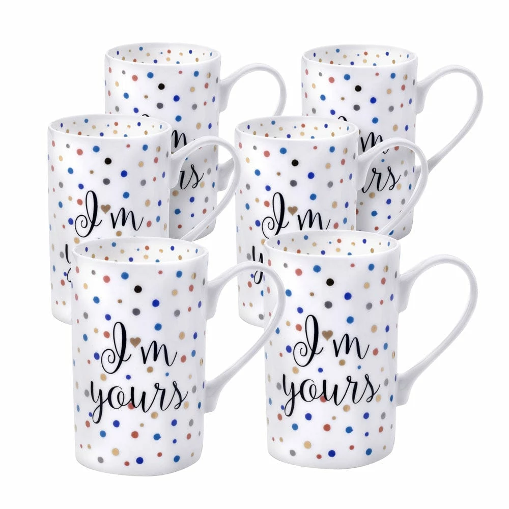 This Set of 6 Confetti I’m Yours Mugs feature a white background glaze, with a fun confetti design, and the loving sentiment “I♥m yours” in the center. The unique design will add a whimsical touch to your everyday dinning.