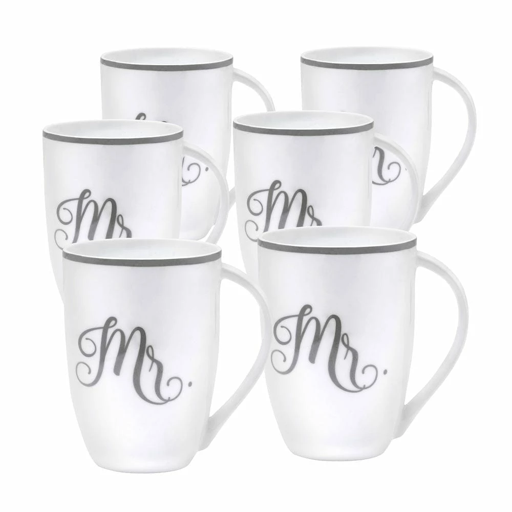 This Set of 6 Mr. Platinum Mugs feature a white background glaze, and a platinum design with the word “Mr.” in the center. The unique design will add a whimsical touch to your everyday dinning.