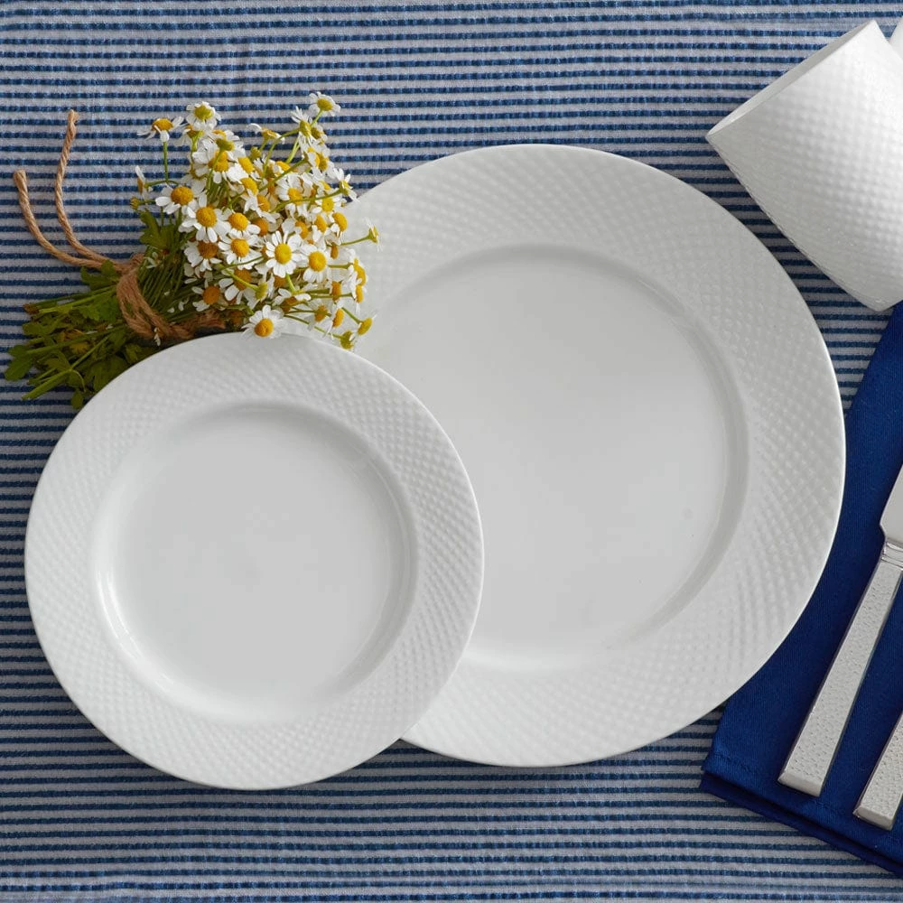 This Stanton Set of 4 Dinner Plates features a dramatic waffle pattern design and will create an eye-catching tabletop by combining classic white simplicity with modern design.