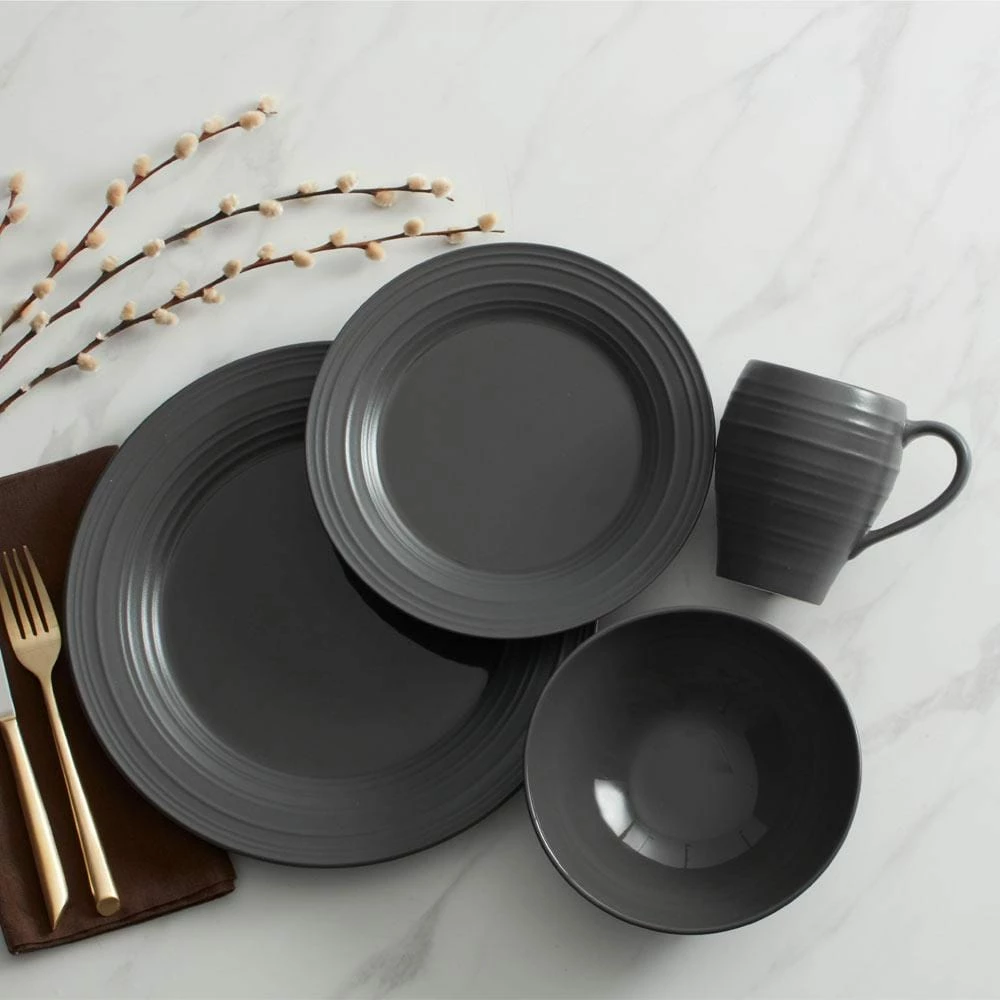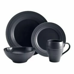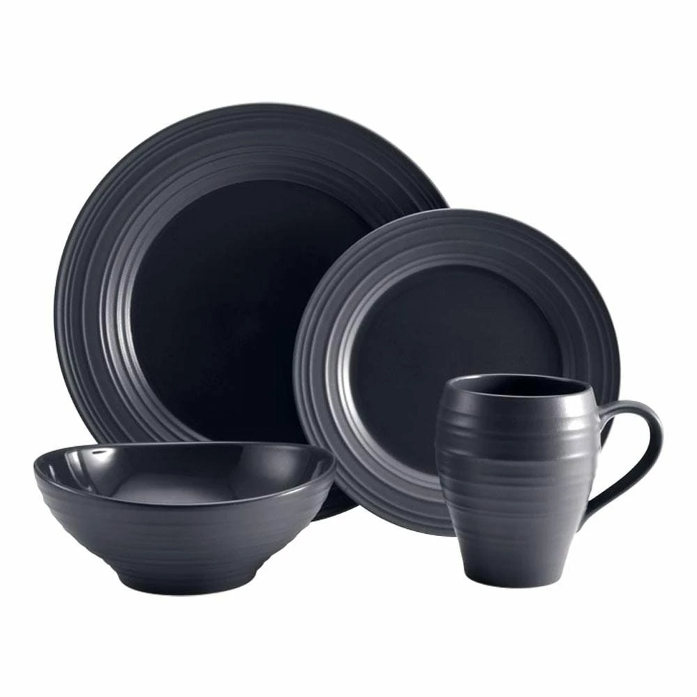 Swirl Graphite combines an organic shape, embossed texture, and dual, matte and shiny finish, for a truly modern look. The graphite color will add a bold touch, and a striking statement with its versatile style. Crafted of ironstone with a pin-firing technique which allows the entire bottom of the plate to be glazed, including the base. This process significantly reduces water absorption and increases chip resistance. 4 piece place setting includes an 11 inch dinner plate, 8-1/2 inch salad plate, 6-3/4 inch (24 ounce) soup cereal bowl and 18 ounce mug. Microwave and dishwasher safe.