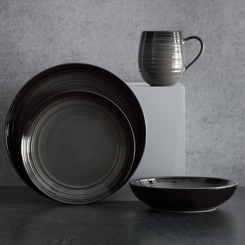 Swirl Graphite combines a coupe shape, shiny finish and an ombre graphite design for a truly modern look. The graphite color will add a bold touch, and a striking statement with its versatile style. Crafted of ironstone with a pin-firing technique which allows the entire bottom of the plate to be glazed, including the base. This process significantly reduces water absorption and increases chip resistance. 4 piece place setting includes an 11-1/4 dinner plate, 9-1/4 inch salad plate, 8-1/2 inch (40 ounce) soup cereal bowl and 20 ounce mug. Microwave and dishwasher safe.