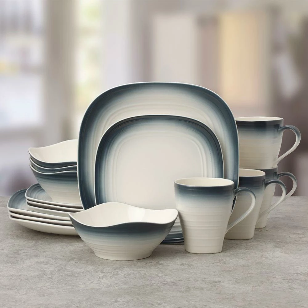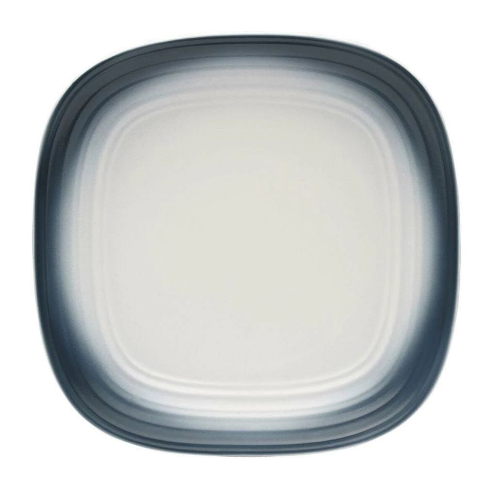 This Mikasa Swirl Ombre Graphite Square Dinnerware Set features clean lines in a rustic, earthy pattern with a matte and glossy finish, and beautifully graduated coloration, with a pin-firing technique, which allows the entire bottom of the plate to be glazed, including the base. This process significantly reduces water absorption and increases chip resistance.