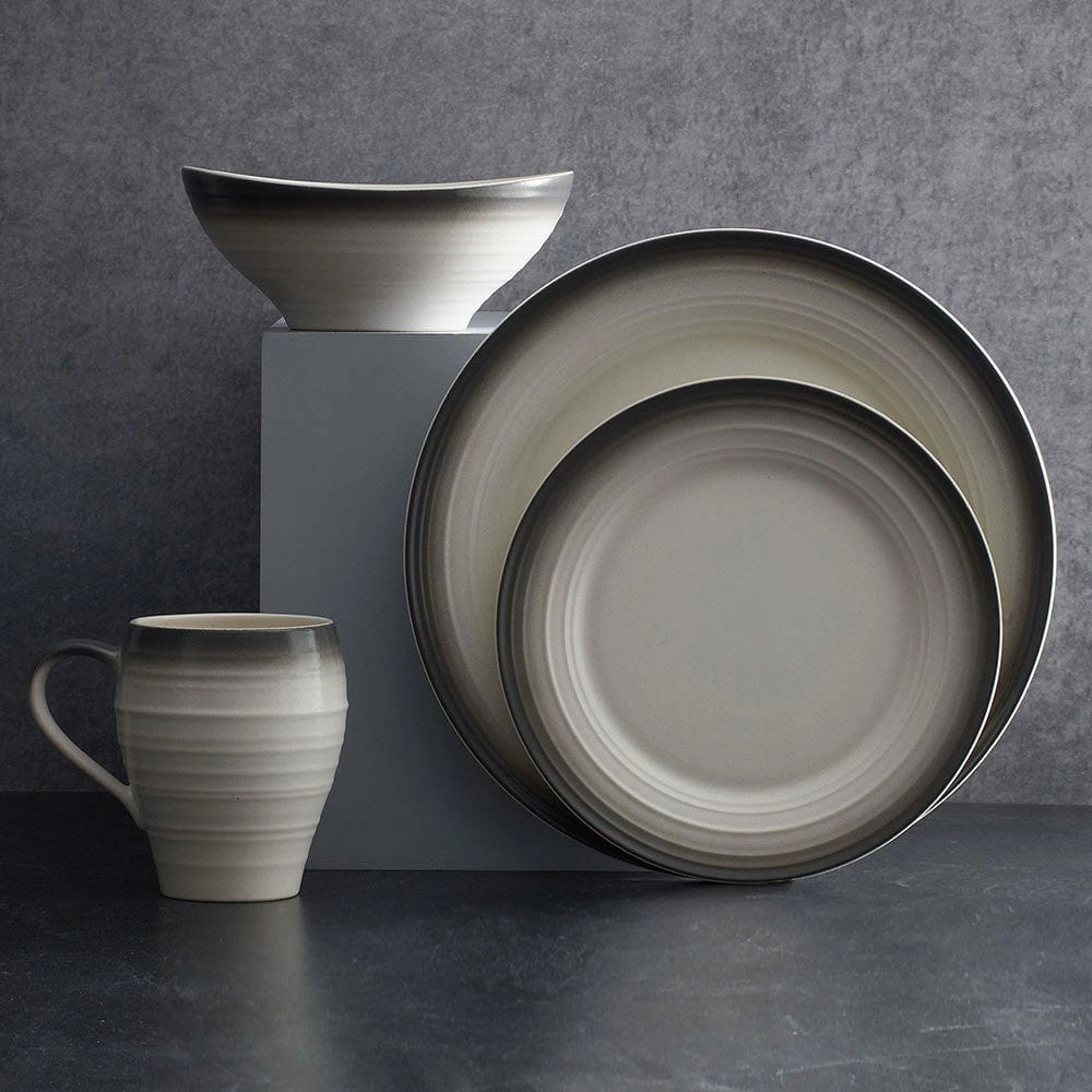 Swirl Ombre features clean lines in a rustic, earthy pattern with a matte and glossy finish, and beautifully graduated coloration, set a striking table setting. The soft rib on the outside of the collection offers a hand made look. Crafted of ironstone with a pin-firing technique which allows the entire bottom of the plate to be glazed, including the base. This process significantly reduces water absorption and increases chip resistance. 4 piece place setting includes an 11-1/4 inch dinner plate, 8-1/2 inch salad plate, 6-3/4 inch (24 ounce) soup cereal bowl and 18 ounce mug. Microwave and dishwasher safe.